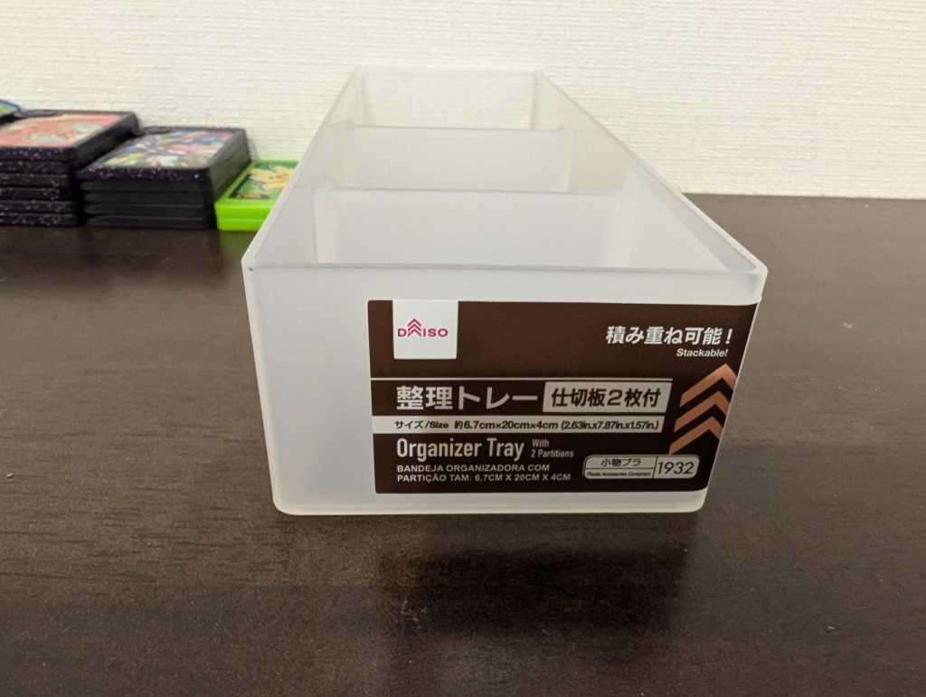 私が実際に使っているおすすめの収納ケースはこちらの【ダイソー】整理トレー(仕切板2枚付)です。