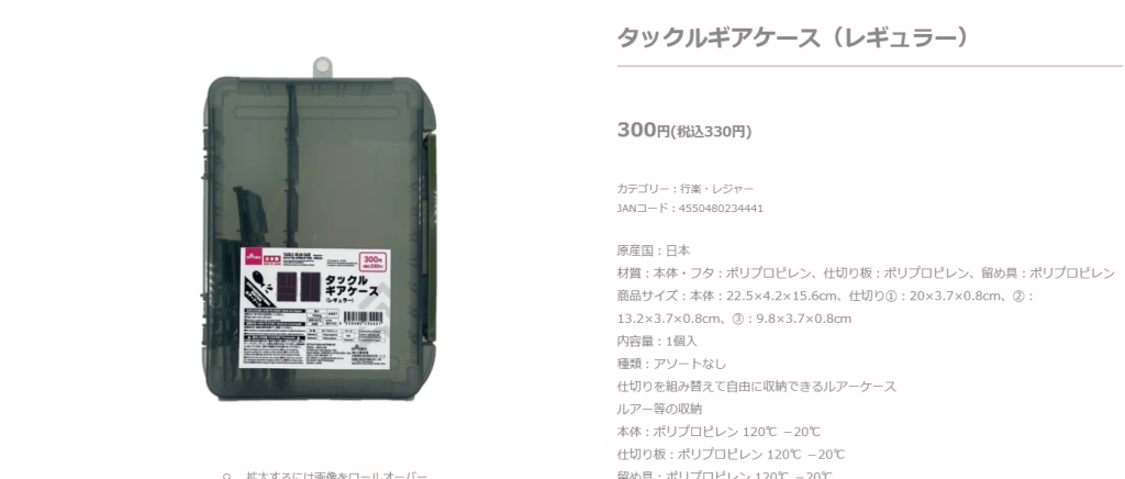 ダイソーのタックルギアケースです、こちらは300円ですが仕切り板の位置を変えられるので便利そうですね。